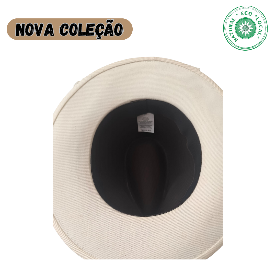 O chapéu é feito em cortiça e forrado a algodão.